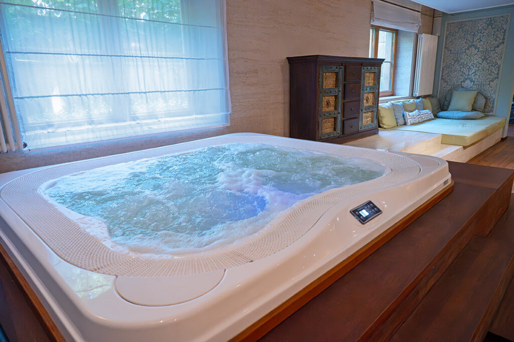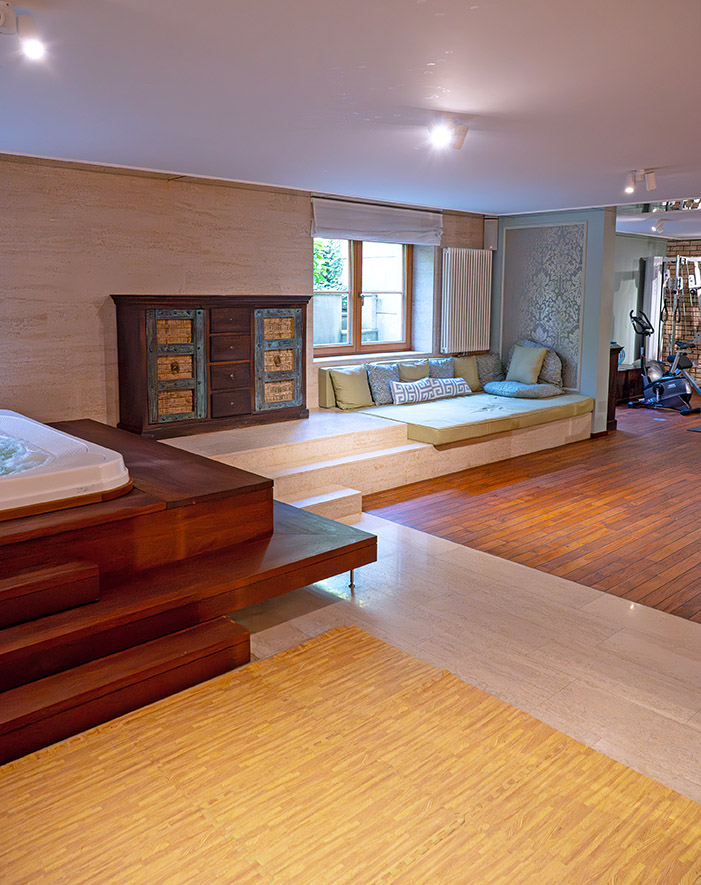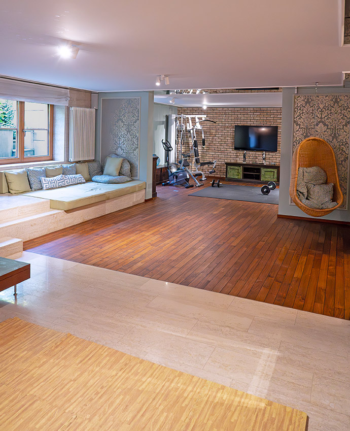 “The flow of natural light through the large windows and patio doors, making the lush surroundings an integral part of the wellness experience”
